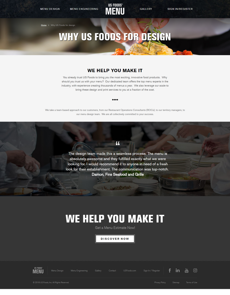 US Foods wanted to launch a comprehensive program that helped them sell their menu-design and menu engineering service while getting more US Foods products on restaurant menus. We created a website with mobile application that made a persuasive case for why restaurant-operators should have a beautiful and professional-looking menu, offering the most profitable items.